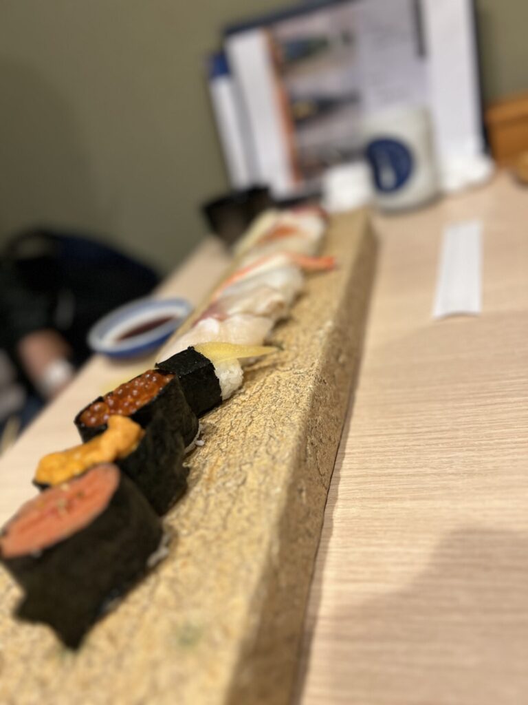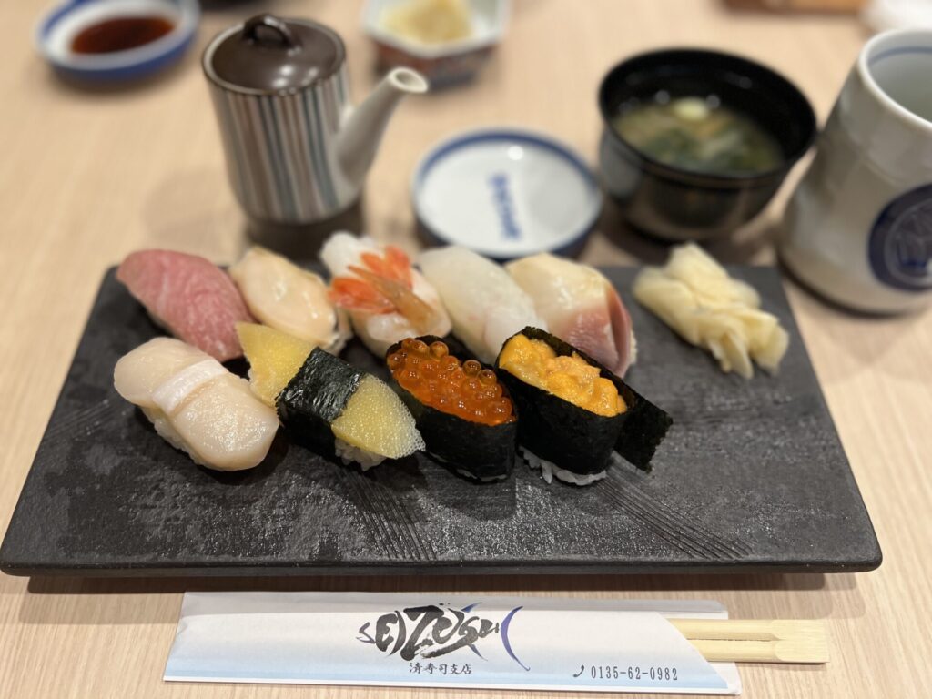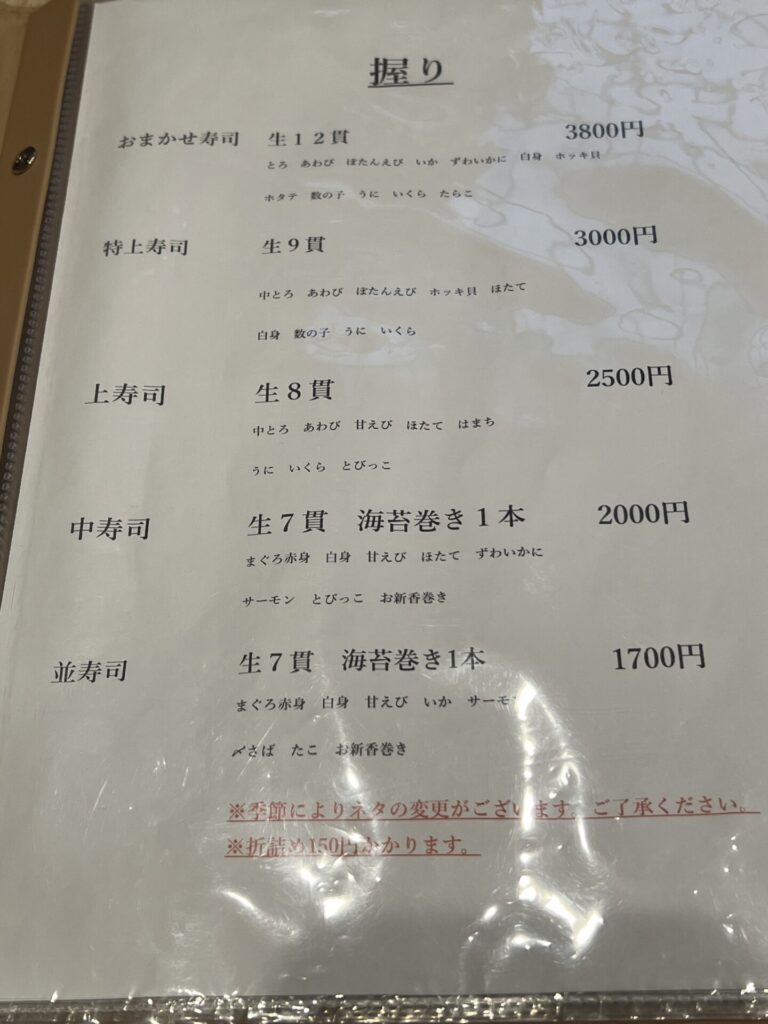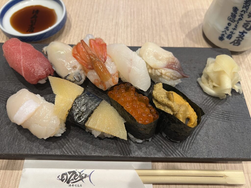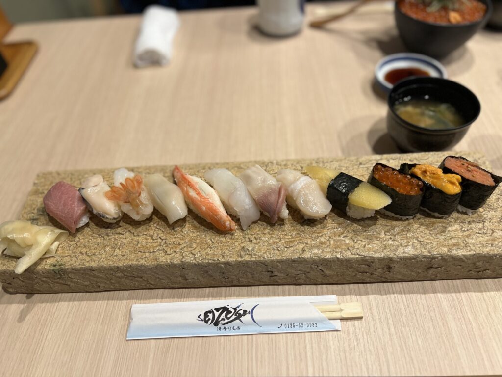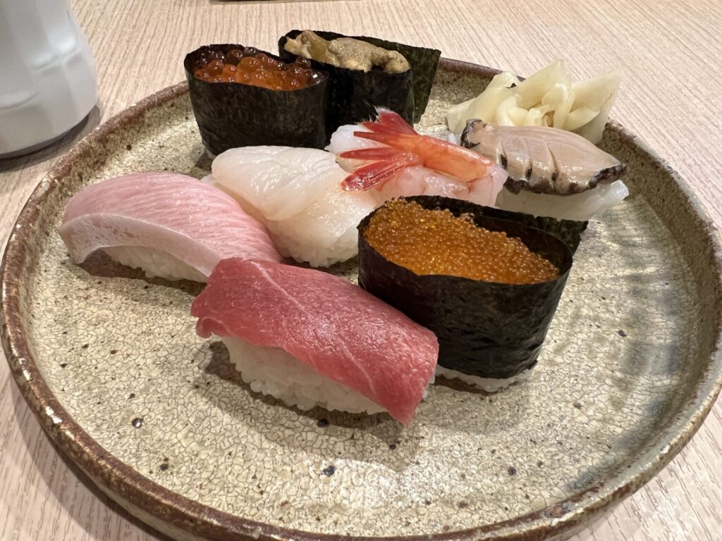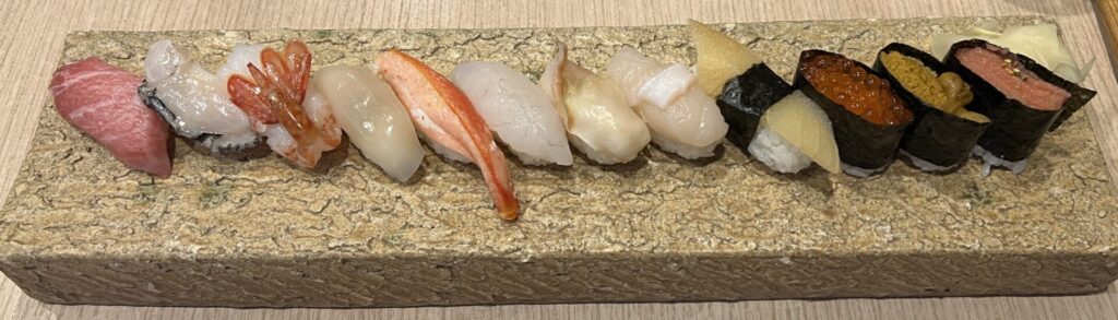 3,400 yen incl. tax (12 pcs with Fatty Tuna, Uni/Sea Urchin, Ikura/salmon roe, Kazunoko/Herring roe, Hotate/Scallop, Awabi/Abalone, Hokkigai/Surf clam, etc.). These were all really tasty and reasonable.